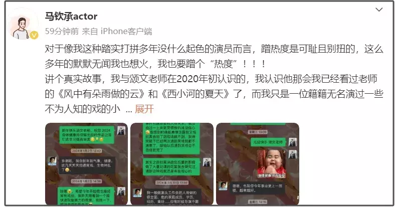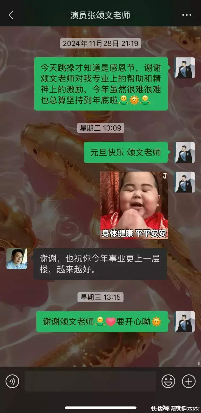 演员马钦承则晒出聊天截图为张颂文说话,称他对不知名的演员很有耐心,有问必答。从聊天截图时间来看,两人接触频繁,多是马钦承向张颂文请教演戏问题,张颂文就分享了自己的经验。再就是节假日的问候,张颂文也都一一回复,元旦的时候张颂文深陷风波,他也积极回应,并祝小演员未来事业进步。