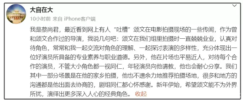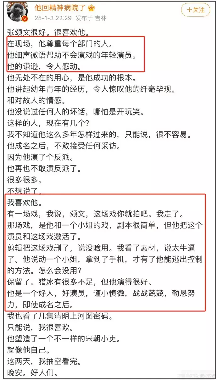 然后就发布长文力挺张颂文,称“张颂文很好,很喜欢他”,表示他尊重每一个部门的人,帮助年轻演员,为人谦逊,不说人坏话。并分享拍摄《猎冰》时张颂文提供了一个精彩的设计,对他的职业给予了高度肯定。