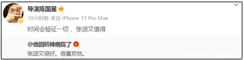 而后,导演陈国星转发并评论了高群书的力挺,表示“时间会验证一切,张颂文值得”。他拍摄过《离婚大战》、《横空出世》等作品,也是一位资深导演。