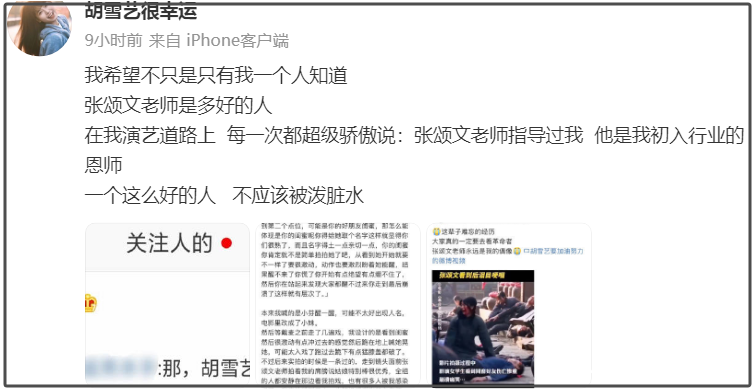 女演员胡雪艺也分享自己被张颂文帮助指导的经历,称一定要让大家知道“张颂文是多好的人,这么好的人不应该被泼脏水”。