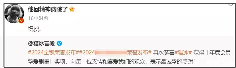 与张颂文合作《猎冰》的总导演高群书是发声当中名气最大的,他先是转发了《猎冰》剧集获得的年度荣誉殊荣表示祝贺。